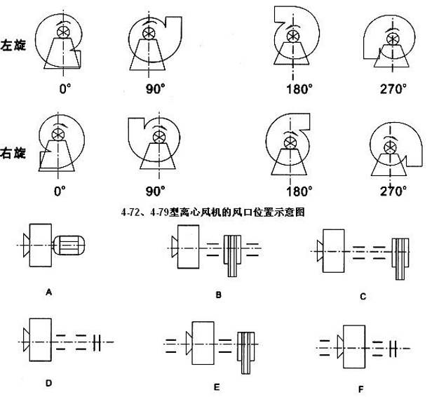 ·公司所有離心風機全部采用訂單制生產,根據客戶的使用需求,為您量身定制,讓您買的稱心用的放心。風機分左旋和右旋兩種型式,從電機(皮帶輪)側正視,葉輪按順時針方向旋轉為右旋,逆時針旋轉為左旋。A式為點擊直聯傳動。B、C、E式為皮帶傳動,D、F式為聯軸器傳動。